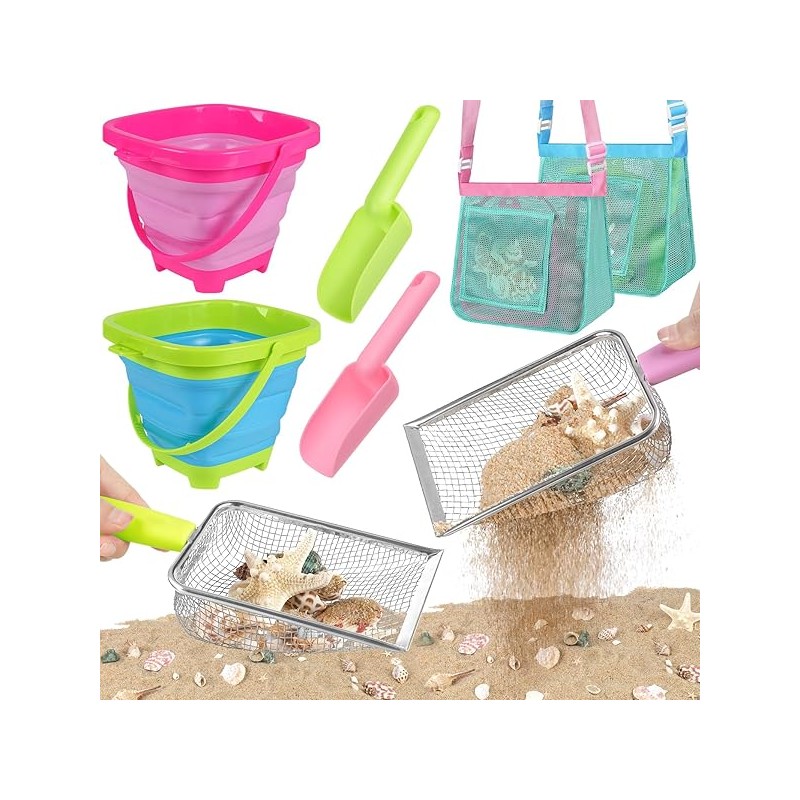Beach Toys, Sand Toys with 2 Collapsible Buckets, Mesh Shovels, Sand Shovels, Mesh Bags for Shell Collecting, Shark Tooth Sifter Sand Dipper Beach Scoop for Kids Boys Girls
