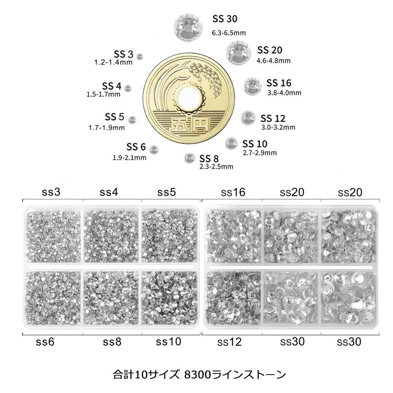 - Large quantity: SS3 (1.2-1.4mm) 1440pcs, SS4 (1.5-1.7mm) 1440pcs, SS5 (1.7-1.8mm) 1440pcs, SS6 (1.9-2.1mm) 1440pcs, SS8 (2.3-2.5mm) 72. PCS, SS1 0(2.7-2.9mm) 720pcs, SS12(3.0-3.2mm) 500pcs, SS16(3.8-4.0mm) 240pcs, SS20(4.6-4.8mm) 240pcs, SS30(6.3-6.5mm) 120pcs Meets Most Size Requirements