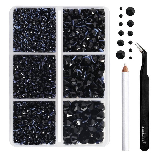 BEADSLAND Hotfix Rhinestones, 4000 PCS Black Rhinestones for Clothes Crafts Mixed 6 Sizes with Wax Pencil and Tweezers Kit, SS6-SS30,Jet Black