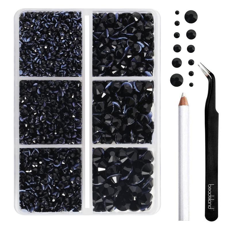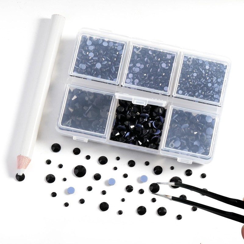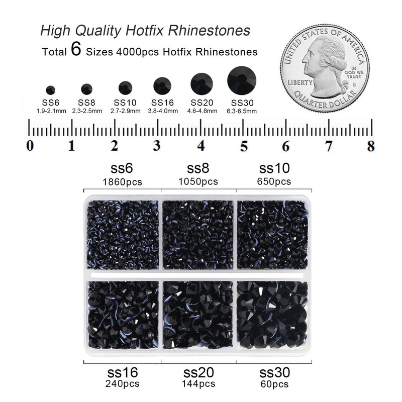 - Package:Pack of 1 box, total 4000 pieces black hot fix crystals rhinestones in 6 sizes,one wax pencils and one tweezers