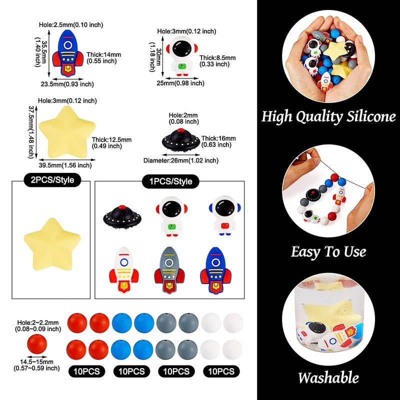 - What You Will Receive: 48pcs Space Theme Silicone Beads, include: 40pcs Round Beads(4 colors, 10pcs/color) + 2pcs Star Beads + 6pcs focal Beads(1pc/style). Size: Round-- about 15mm, hole: 2-2.2mm. Star--39.5x37.5mm, Hole: 3mm. Focal Beads--about 26-35.5mm, hole:2-3mm.