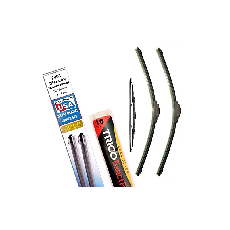 - This wiper blades set for 2003 Mercury Mountaineer contains a 22" WiperBladesUSA Gold beam blade for your Driver Side + a 22" WiperBladesUSA Gold beam blade for your Passenger Side + a 16" Trico Exact-Fit Wiper for your 2003 Mercury Mountaineer rear window wiper
