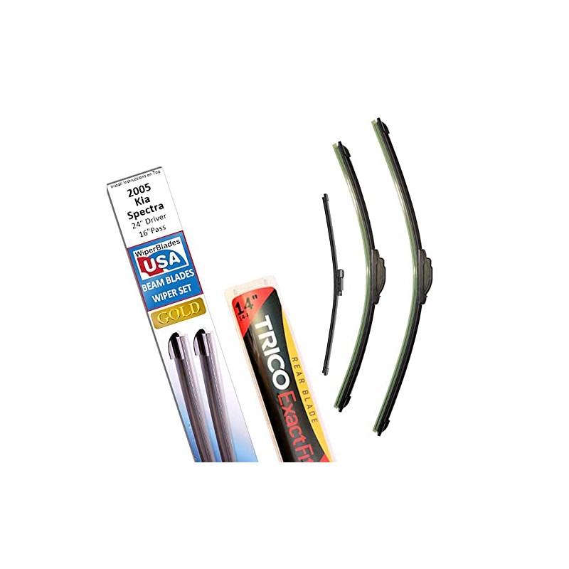 - This wiper blades set for 2005 Kia Spectra contains a 24" WiperBladesUSA Gold beam blade for your Driver Side + a 16" WiperBladesUSA Gold beam blade for your Passenger Side + a 14" Trico Exact-Fit Wiper for your 2005 Kia Spectra rear window wiper