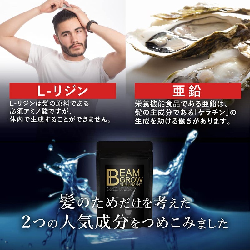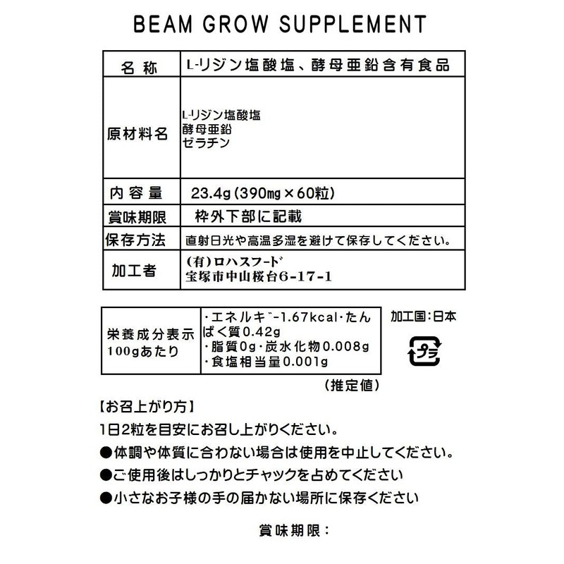 - 【神戸ロハスフードのBEAM GROW SUPPLEMENT】はつらつとした日々を過ごしてもらいたいという願いから生まれました。L-リジンと亜鉛で内側から太く強くを目的に研究し作られたサプリメントです。 最高の配合で身体の中からハリ・コシを! 男性にも女性にも充実した生活のためにサポートとセルフコントロールを行い、「今日もがんばるぞ!」というパワーをのぞんでいる全てお客様のために、日々研究を重ね、より良い成分をより良い形でお届けすることに全力を注いでいます。世界に誇る日本ブランドとして、日本の〈GMP認定工場〉で製造した材料を神戸ロハスフードの自社国内工場で加工し、検品を一つ一つしっかりと行うことで世界中のお客さまに安心してご利用いただけるように細心の注意を払っています。 私たちが自信を持ってお届けするサプリメントをお試しください。お客様が喜んでくださることが私達の喜びでもあります。応援メッセージが研究員の日々の励みになっておりますので、レビューの投稿をお待ちしております。さらなる高みを目指し、日々努力してまいりますので今後とも神戸ロハスフードをよろしくお願い申し上げます。