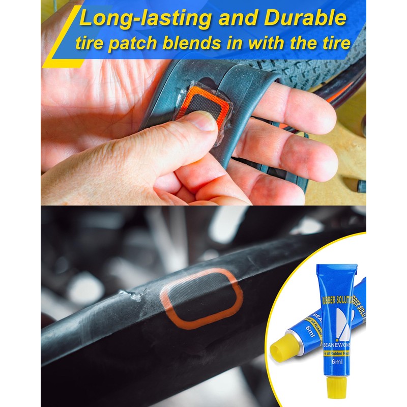 - Tire Repair Glue Refill: As a refill for bike tube patch kit, it includes 8 pieces of high-strength, high-quality glue (6 ml Tube) and a small storage box