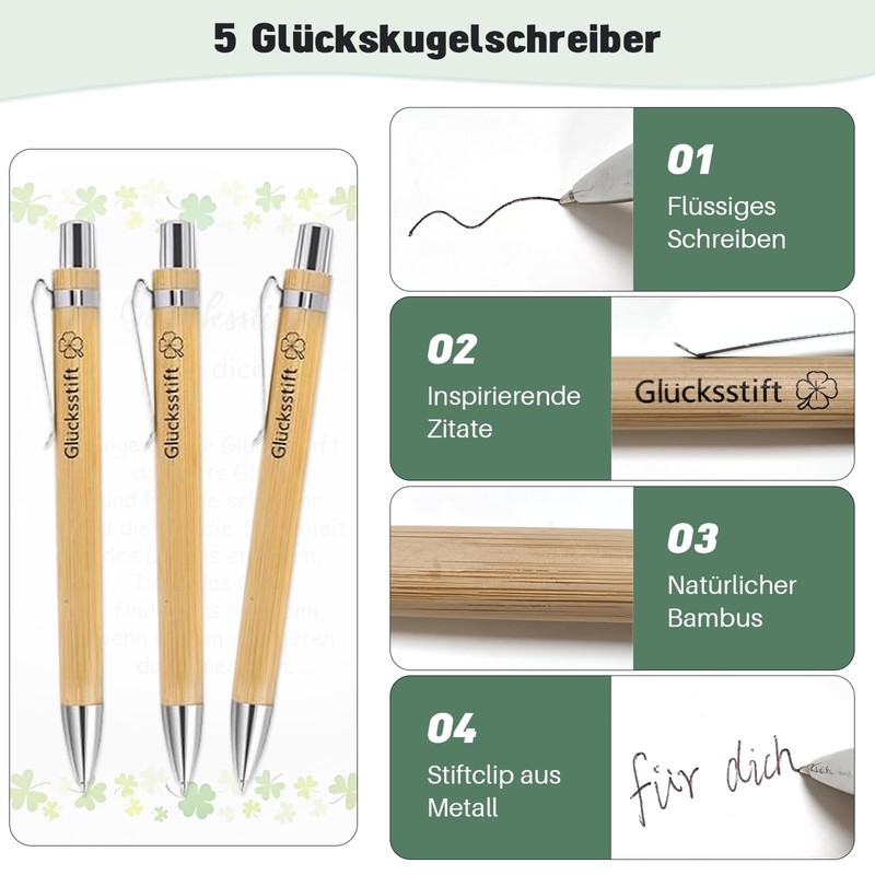 - Motivational notebooks & bamboo pens: your sustainability companion for the desk! This set combines 5 stylish notebooks with inspirational saying and eco-friendly bamboo pens. Whether for work orders, creative ideas or private notes - here you stay organised and do good for the environment at the same time.