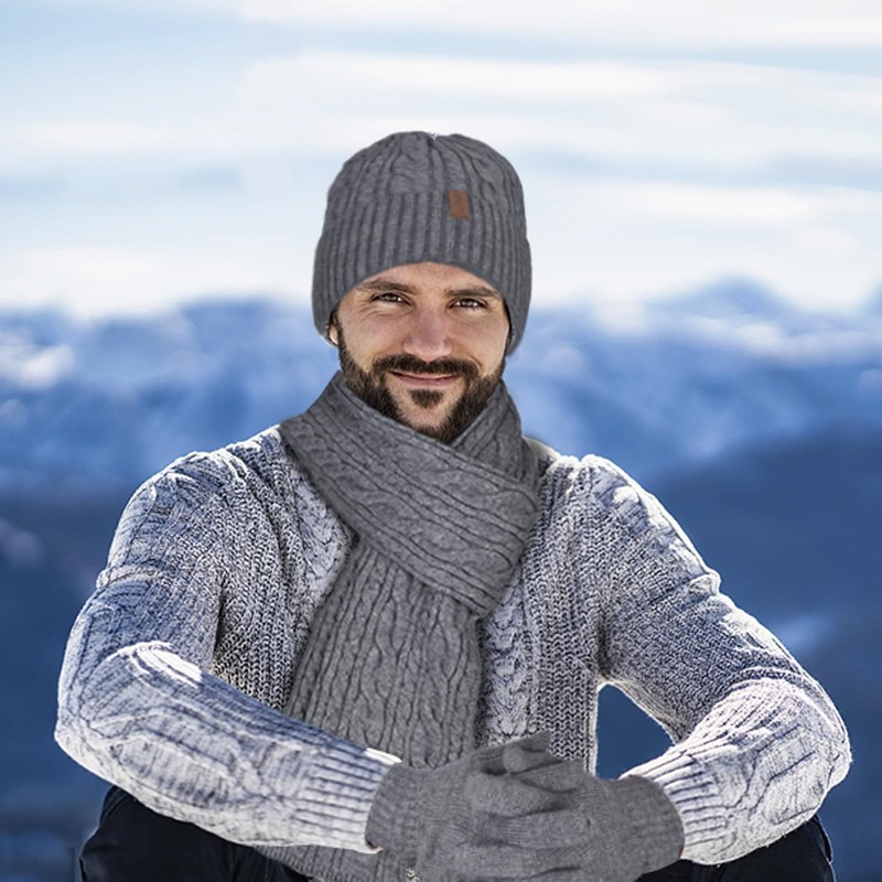 Beanie Hat Gloves Scarf Set for Men Winter Warm Knit Knitted Neck Warmer Touchscreen Glove Cap 3 in 1 Gray Thermal Fleece Wool Lined for Cold Weather Snow