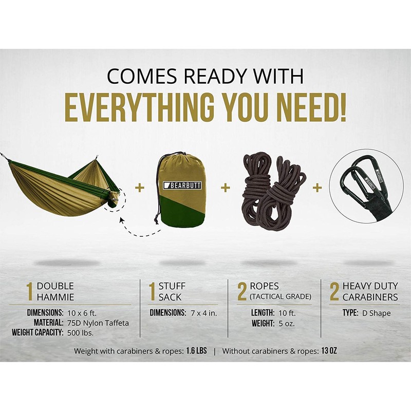 - PLENTY OF ROOM - The Bear Butt travel hammock has so much room for Two people to fit comfortably and with a legal weight capacity of 500lbs you can enjoy time with loved ones hammock camping. Get Yours Now.