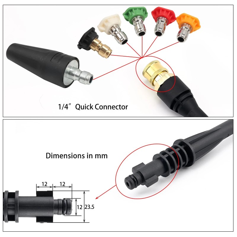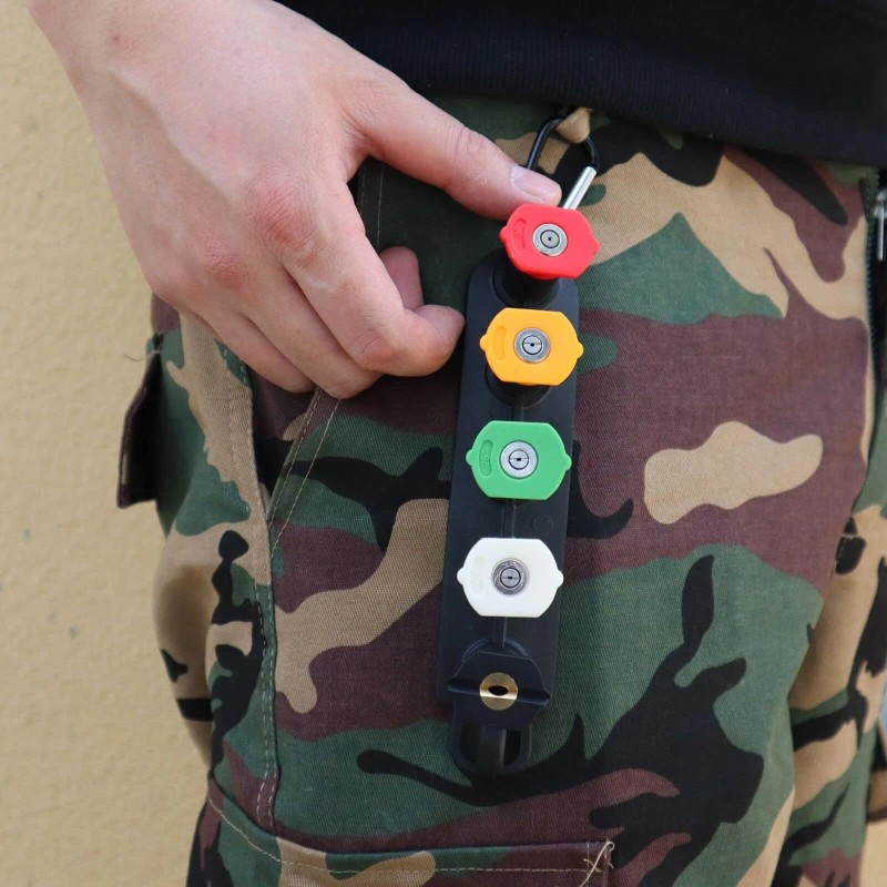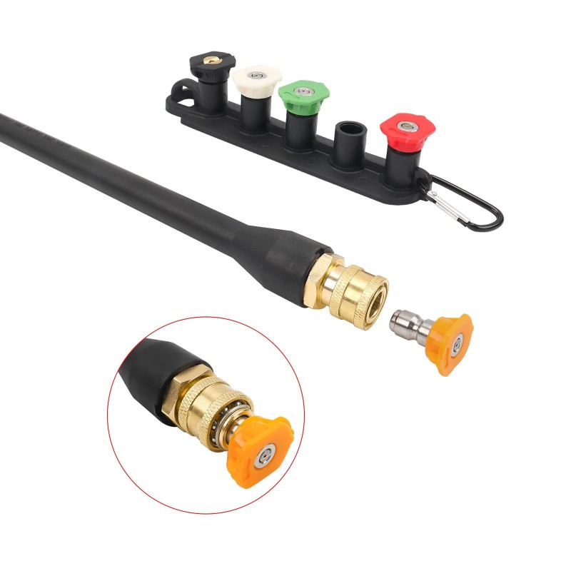 1. Package Includes: Spray Wand with 1/4” Quick Connector, 5 Spray Tips ( 0°- red, 15°- yellow, 25°- green, 40°- white, 65°- black, orifice size #035), Turbo Nozzle (orifice size # 035), Belt Clip Nozzle Holder.