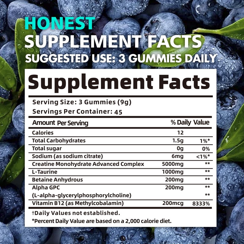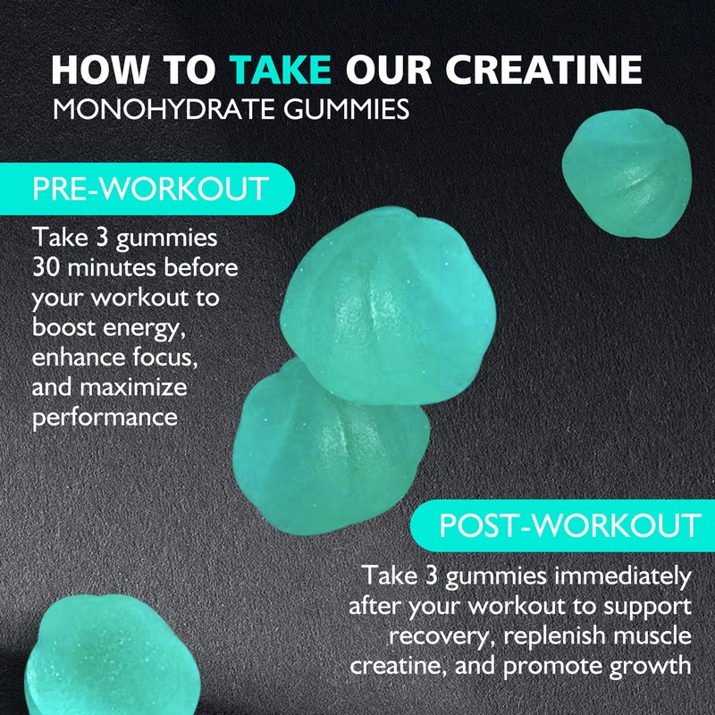 5g Creatine Monohydrate per Serving: Each serving of 3 gummies delivers 5g of pure creatine monohydrate, supporting enhanced muscle strength and performance.