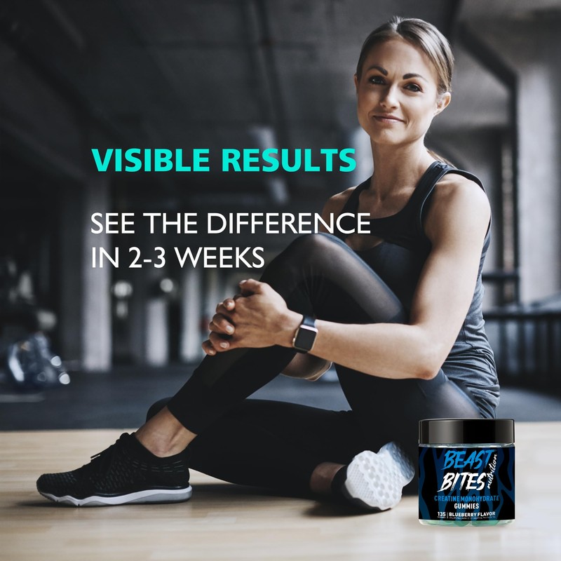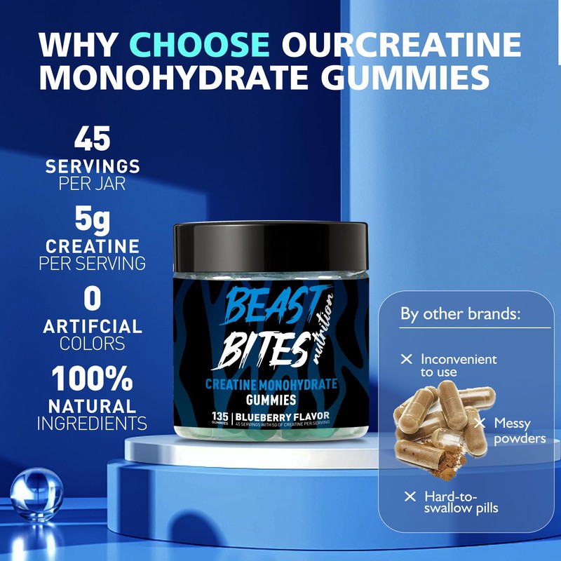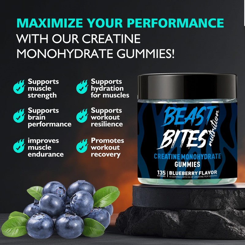BEAST BITES Nutrition Creatine Monohydrate Gummies for Men & Women - 5g of Creatine Monohydrate per Serving - Sugar Free,Vegan, Blueberry Flavor, 135 Count.