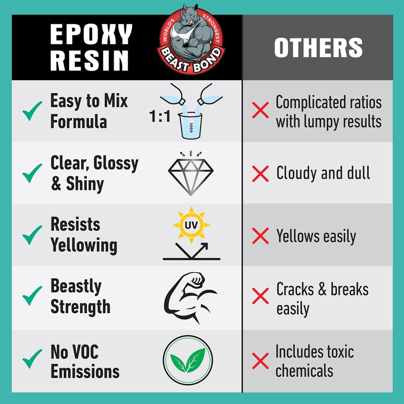 - Highest Performance On The Market – Beast Bond’s professional-grade clear epoxy resin and hardener is the perfect formula to bring your art alive while protecting with beastly, hard as a rock, durability. Our artisan-approved epoxy cures crystal clear with no imperfections and a stunning ultra-glossy finish with no polishing needed. Get inspired and create long-lasting, scratch and moisture-resistant resin art pieces that won’t yellow over time.