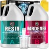 - All You Need In One Set – Our resin kit has everything you need to get your resin crafts on! Try your hand at unique jewelry, wood features, tabletops and more. Our 2 part epoxy resin kit includes clear resin (1/2 Gallon), hardener (1/2 Gallon), 5 mixing sticks, spatula, 2 measuring cups (16.9 oz), gloves, and a step-by-step manual.