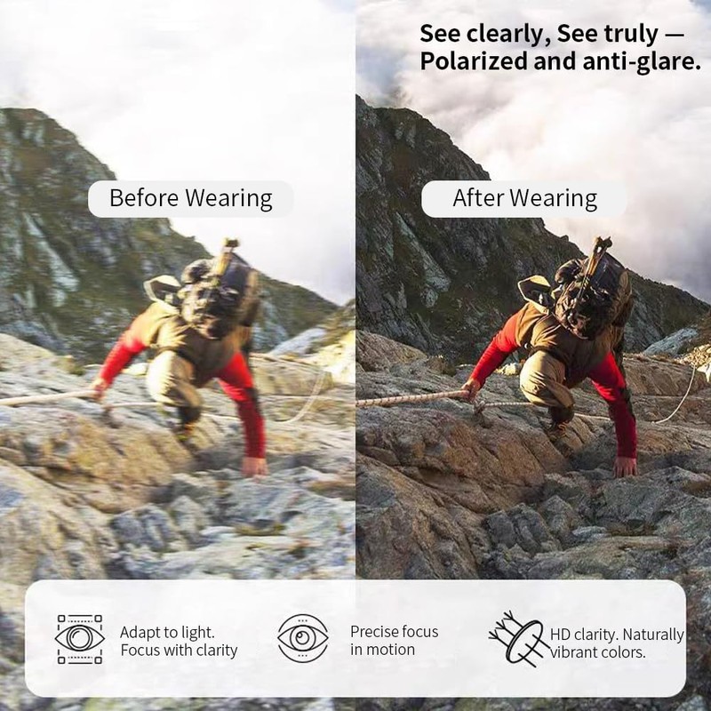 - Comfortable, Sport-Ready Fit Lightweight wraparound frame with non-slip grip ensures stability on the move—whether you're lifting, climbing, cycling, or fishing.