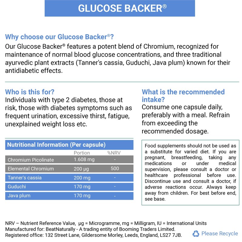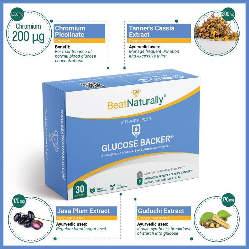 - Why choose our Glucose Backer? Our Glucose Backer features a potent blend of Chromium, recognized for maintenance of normal blood glucose concentrations, and three traditional ayurvedic plant extracts (Tanner's cassia, Guduchi, Java plum) known for their antidiabetic effects.