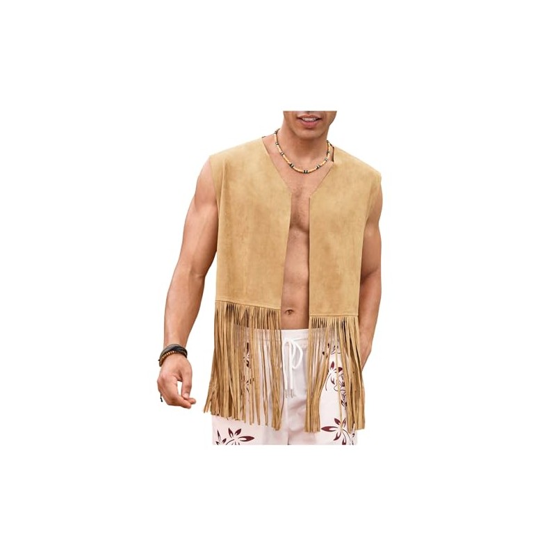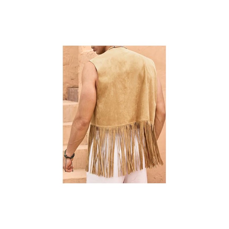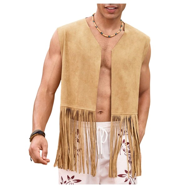 BEAUDRM Men's Fringe Suede Vest Boho Tassel Open Front Sleeveless Western Jacket Outerwear 70s Outfits Khaki X-Large