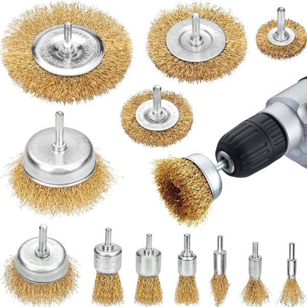 BEAUGIREW 12 Pieces Drill Wire Brushes Brass Coated Wire Brush Drill Attachment Set Wire Drill Brushes with 1/4 inch Shank for Cleaning Rust Removal Polishing Deburring Paint Removal