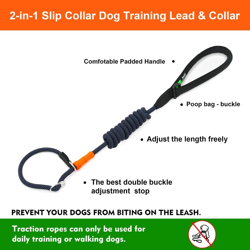 - 【2 IN 1 DOG LEAD AND COLLAR】NO-Pull lead leash,Just slide the adjustable loop over your dog’s heads simply,And use the soft and comfortable handle end as a traction belt,dog slip rope leash acts as collar and leash in one, fits all dogs.
