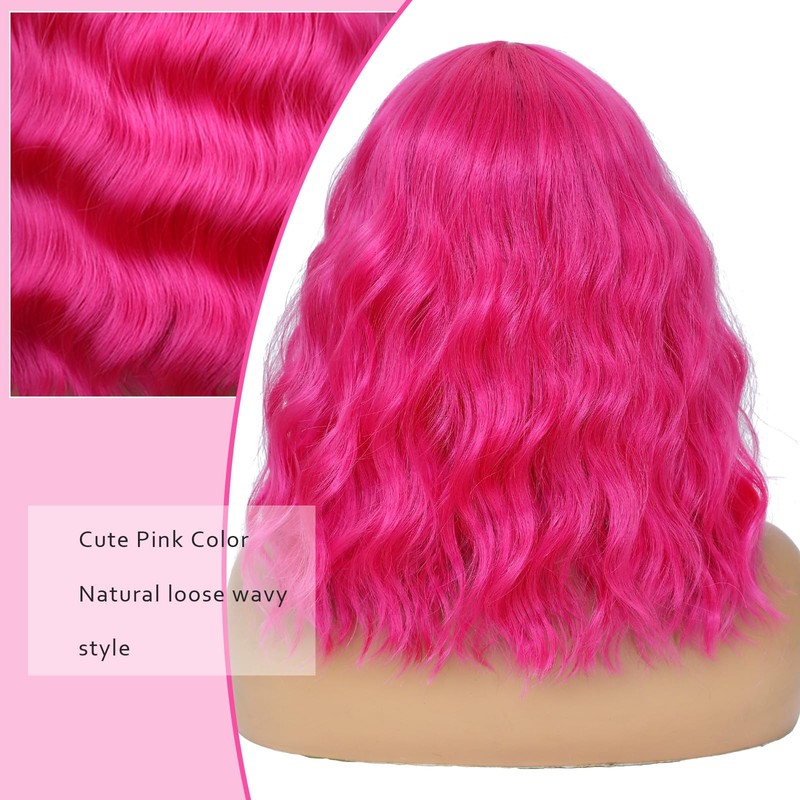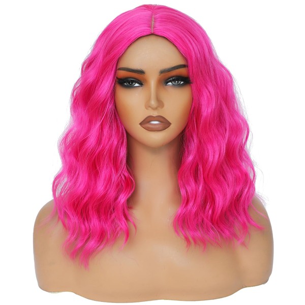 BEAUTIFA Hot Pink Wig for Women Wavy Curly Pink Bob Wigs Middle Part 14 Inch Shoulder Length Heat Resistant Synthetic Colorful Wig