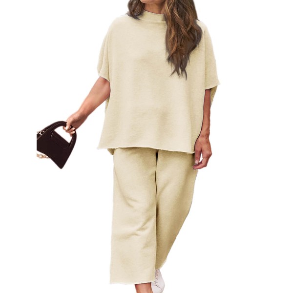 Beautife Women's Plus Size 2 Piece Outfits 3/4 Batwing Sleeve Capelet Crew Neck Pullover Top Wide Leg Pants Lounge Set Apricot