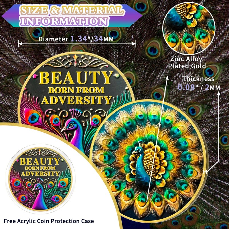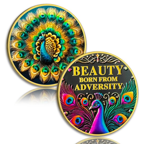 - BEAUTY BORN FROM ADVERSITY: The colorful peacock on the front of the sobriety coin symbolizes confidence and dignity after rebirth, affirming our self-worth and reminding us to hone ourselves in the face of adversity and discover our inner beauty. The words “BEAUTY BORN FROM ADVERSITY” on the AA/NA coins inspire us to go through the challenges and pains of life to shine brighter. This is a unique sobriety gift that is well worth collecting