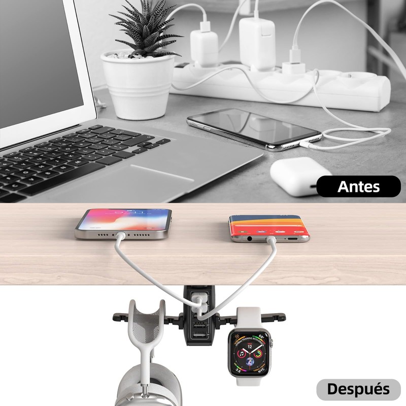 - 【Organizador Multifuncional 5 en 1】El soporte para audifonos combina un soporte para auriculares y un cable de alimentación en uno, con capacidad para 2 auriculares, 3 pares de auriculares con cable / 3 cables USB al mismo tiempo. La base adhesiva ultra resistente soporta hasta 2 kg, móntalo debajo de tu escritorio para ahorrar espacio, ideal para escritorios pequeños o espacios reducidos.