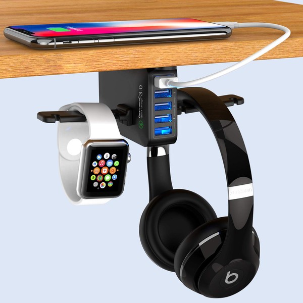 BEAUTY CHOICE Soporte para Audifonos con Cargador USB, Porta Audifonos Doble, 5 Puertos USB QC3.0, Headphone Stand Debajo del Escritorio, Accesorios de PC Gamer, Gancho para Colgar Auriculares