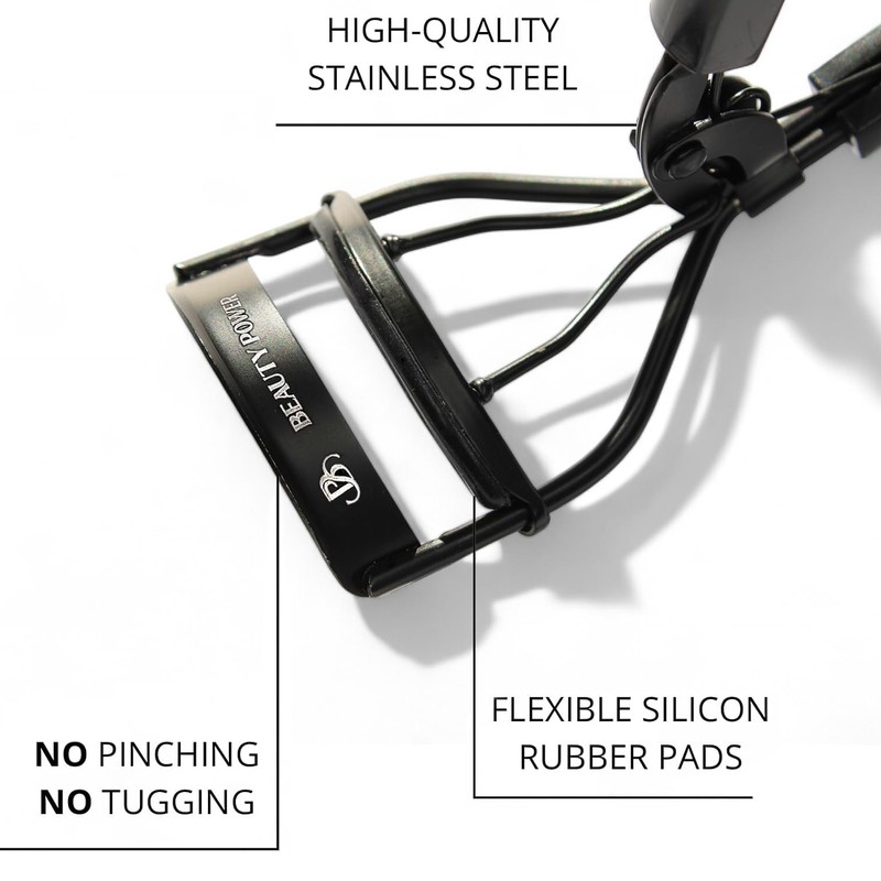 Beauty Power Eyelash Curler with 5 Replacement Pads, Brush for Eyebrows, Sating Travel Bag - Perfect Curls/Lash Lift in Seconds - Gentle & Safe - Extra Curl - German Stainless Steel (Black)
