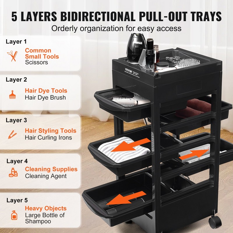 VEVOR Beauty Salon Trolley Cart, Plastic Salon Rolling Cart for Stylist with 5 Removable Drawers & Dryer Holder, Rolling Hairdressing Cart with 4 Wheels (2 Lockable) for Beauty SPA Barbershop