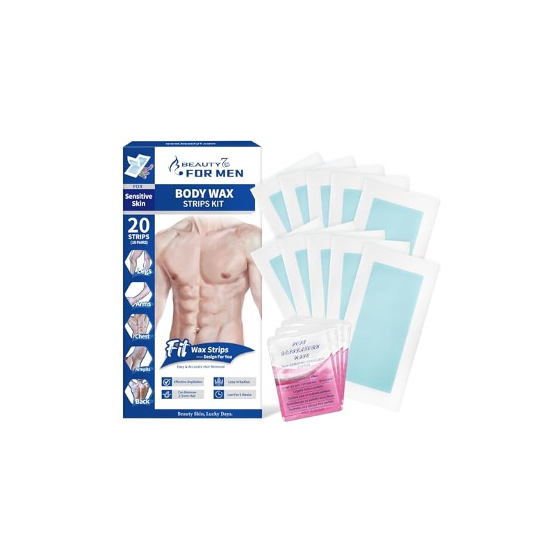 Beauty7 Men Wax Strips for Body 2 SETS, Ready to Use Wax Strips, Facial Hair Removal, Legs Arms Chest Waxing, At Home Waxing Kit, 40 Waxing Strip 8 Calming Oil Wipes