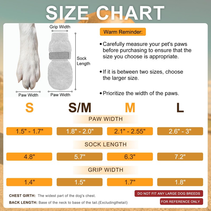 - SIZE MATTERS: Includes 4 dog socks with grippers. 1.8" paw width for size small; 2.1" paw width for size small/medium; 2.55" paw width for size medium; 3" paw width for size large. Be sure to measure your pet before purchasing to ensure a perfect fit. If your dog's paw width falls between two sizes, choose the larger size for a more comfortable fit. Any other questions, please contact us