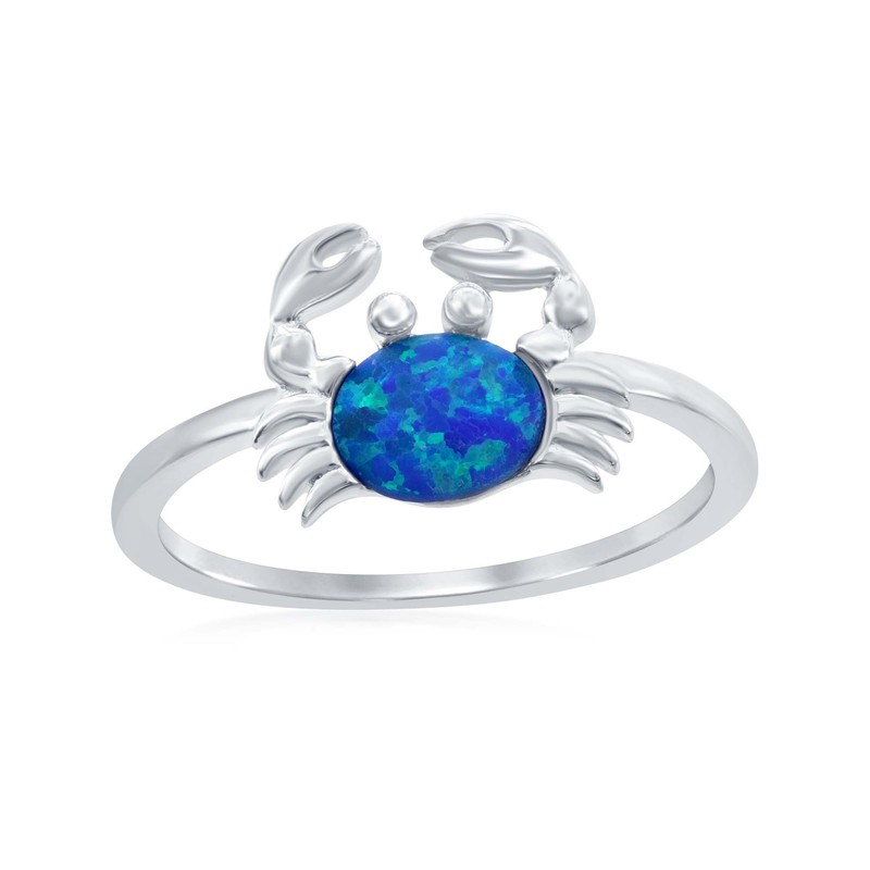 - This cute sterling silver created blue opal crab ring was inspired by the Caribbean, it will take your breath away with the Caribbean inspired water color crated blue opal stone. The main design on this ring is a cute crab with divine details giving it a charismatic feel to bring out the wonderful blend of the green and blue tones.
