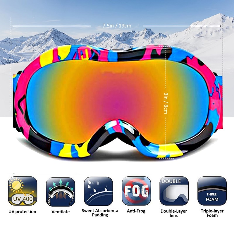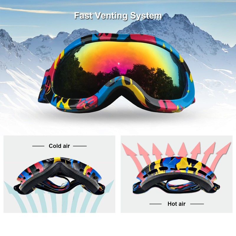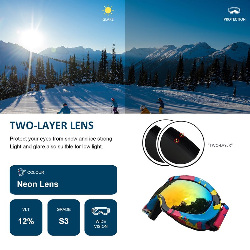 - Double-layer Lens, Shatterproof, scratch resistant, anti-reflection ,anti-fog , 100% UVA, UVB protection lens . 720 DPC lens with advanced technology designed to eliminate wind. maximize the protection for kids’ snow sports.