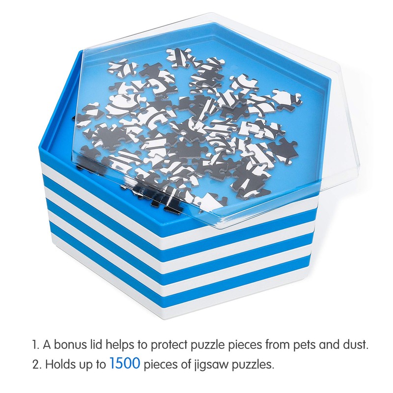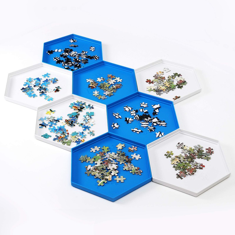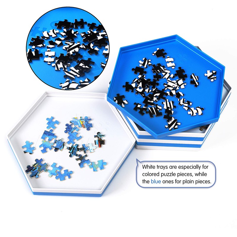 - STACKABLE DESIGN – The cute hexagonal trays can be stacked up easily for compact organization. Place the lid on the topmost tray and put them into the colored box for space-saving storage and transportation for puzzle pieces.