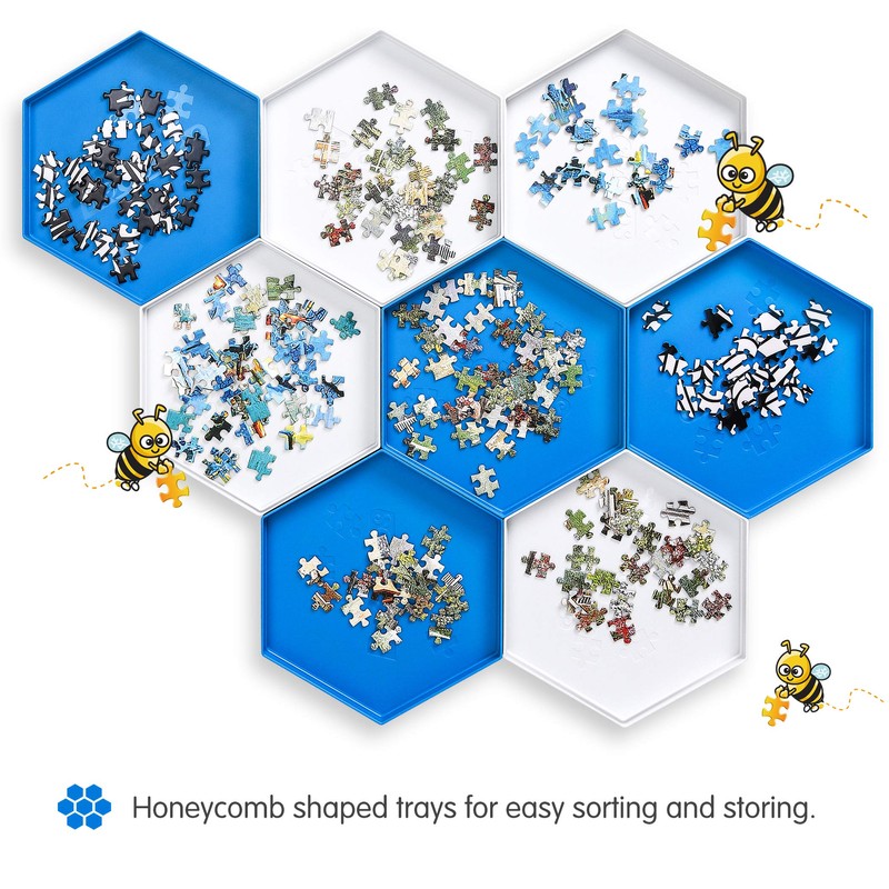 Becko Stackable Puzzle Sorting Trays Jigsaw Puzzle Sorters with Lid Puzzle Accessory for Puzzles Up to 1500 Pieces, 8 Hexagonal Trays in White & Blue by Becko US