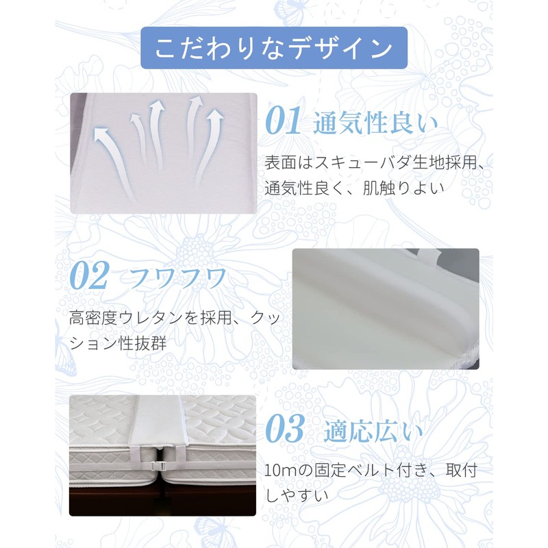 - (Prevents Gap Problems) The T-shaped pad is placed in the vertical T-shaped portion between the mattress, so it does not slip easily. Made of highly flexible urethane that is thick, so it is hard to feel the seams and the edges of the mattress, and it will not feel discomfort. Comes with 2 connecting bands to secure the belt to prevent the pad from shifting and floating
