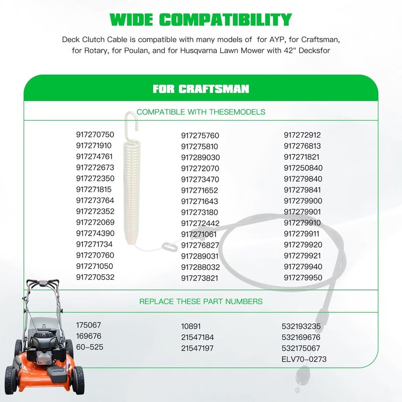 - Compatibility: Replace Part Numbers: 175067, 169676, 60-525, 10891, 21547184, 21547197, 532193235, 532169676, 532175067, ELV70-0273; Fit for several AYP, for Craftsman, for Rotary, for Poulan, for Husqvarna models with 42" Decks; Compatible for Weed eater 165T42A 14542L 2242 Riding Lawn Mower. Replacement for Craftsman LT1000 LT2000 DLT 3000. Fits for Ryobi HDK19H42 (96016000400) Lawn Tractor; See full list in description