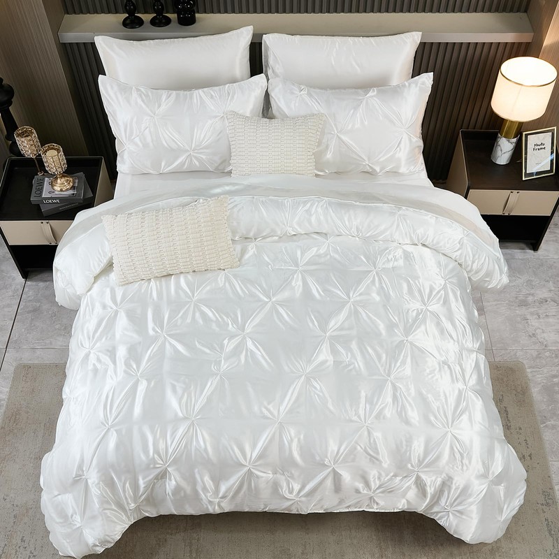 Bedbay White Satin King Comforter Set with Sheets,Pinch Pleat Bedding Set Roo...