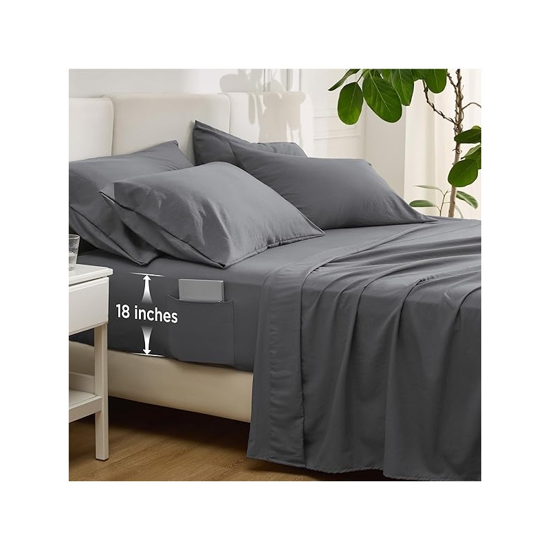 Bedsure Deep Pocket Queen Sheets - 6 Piece, Prewashed Ultra-Soft Queen Sheet Set, Fits Mattresses Up to 18 Inches Thick, Breathable & Secure Fit, Hotel Luxury Bedding, Grey