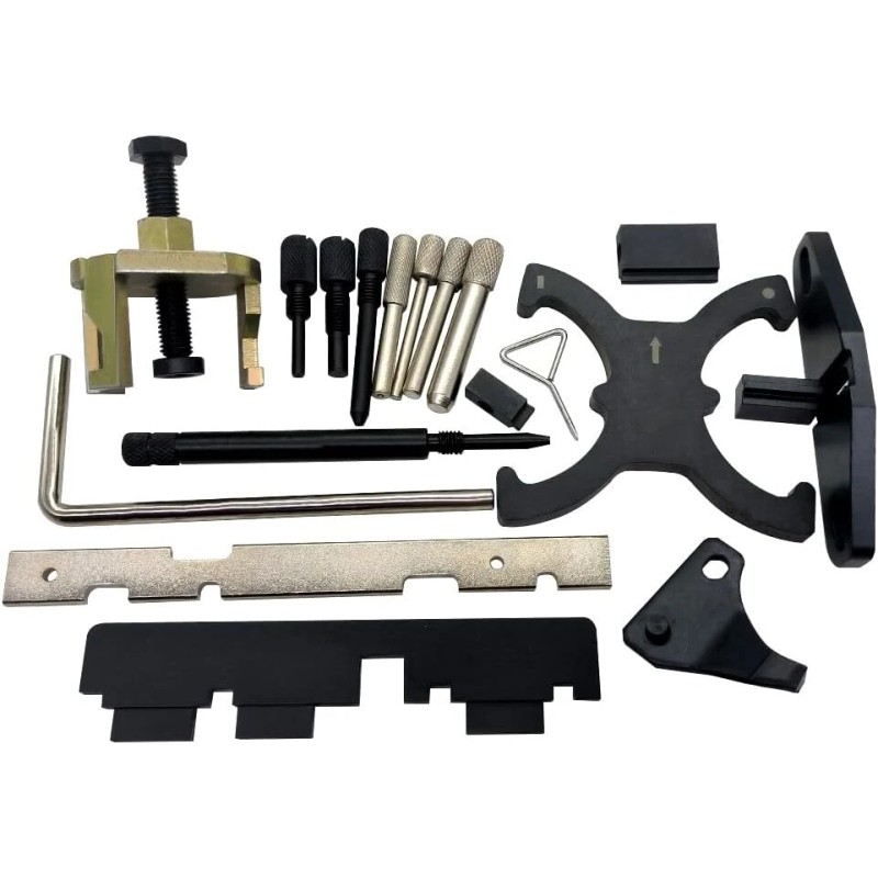 - Items Contain: This kit includes 18 tools: 1 flywheel locking tool with 2 adaptors; 9 timing pin; 1 Camshaft positioning plate; 1 Timing belt tensioner; 1 Variable camshaft timing hydraulic control device; 1 Camshaft sprocket puller; 1 Crankshaft shock absorber; 1 Camshaft positioning plate