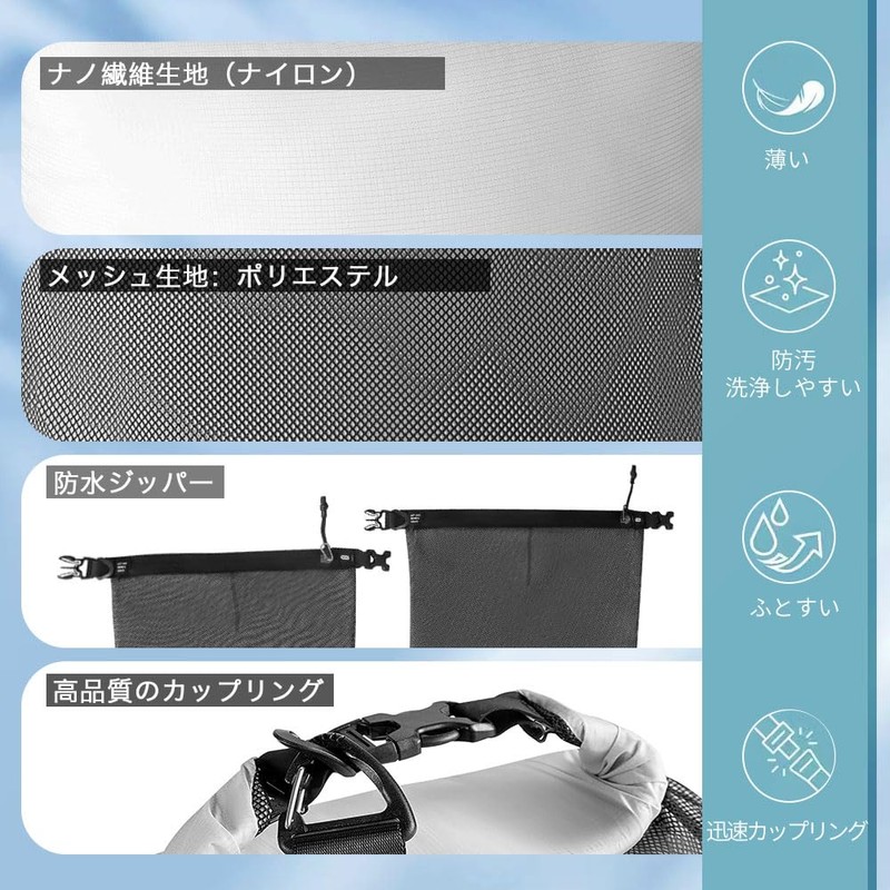 - Wet/Dry Separation - Waterproof bag design has been renewed. Added mesh design allows wet and dry clothes to be more properly separated. It can be used as a handbag or backpack for storing dirty clothes separately