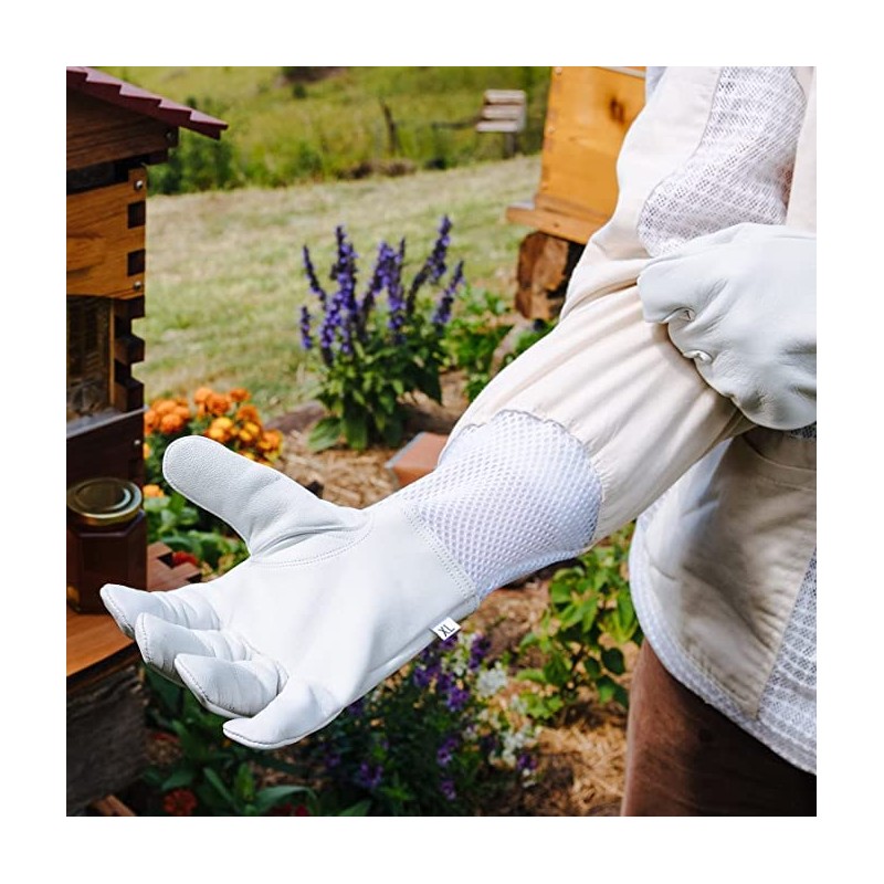 - Professional goat leather hands beekeeper gloves, ventilated wrists, elastic cuffs medium-weight and durable canvas sleeves, A thick beekeeping gloves can keep your body sting-free. Which are designed to offer you unparalleled dexterity and maximum protection.