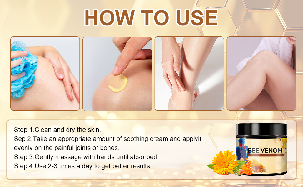 - Advanced Bee Venom Therapy Cream – Formulated with natural ingredients like bee venom, honey, and essential oils to help soothe joints, enhance flexibility, promote relaxation, and improve mobility.