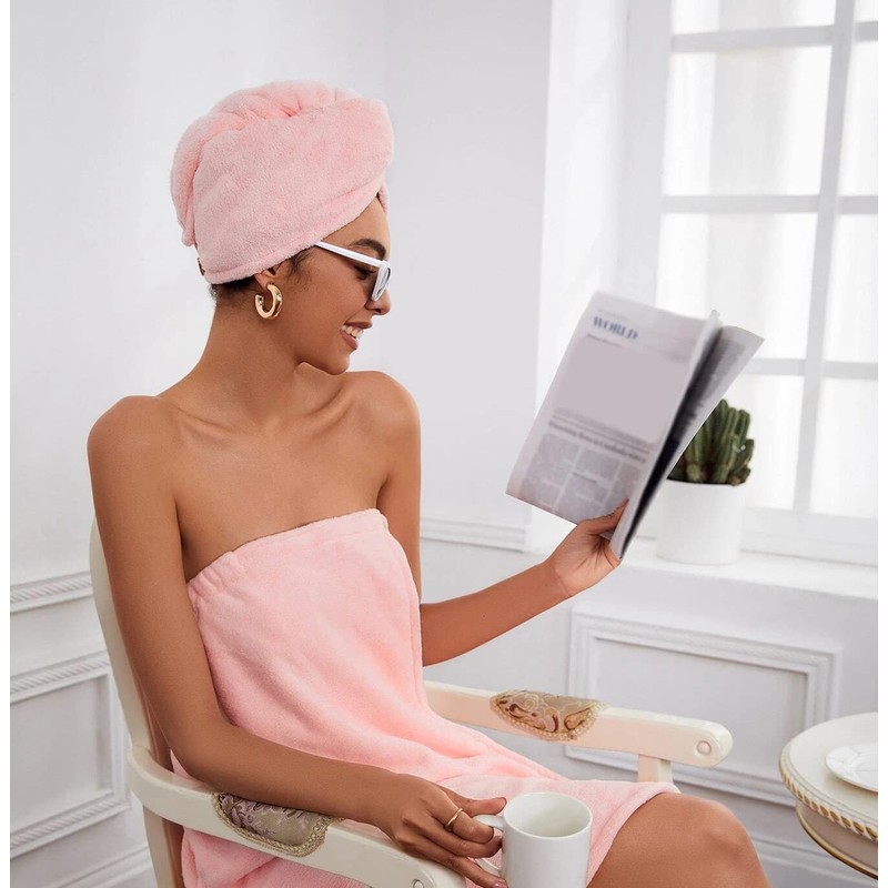 Después de lavarte el cabello, envuélvelo en la toalla y asegúralo con el botón. Puede estar seguro de que la toalla no se resbalará. Tu cabeza se mantiene cálida y acogedora mientras tu cabello se seca.