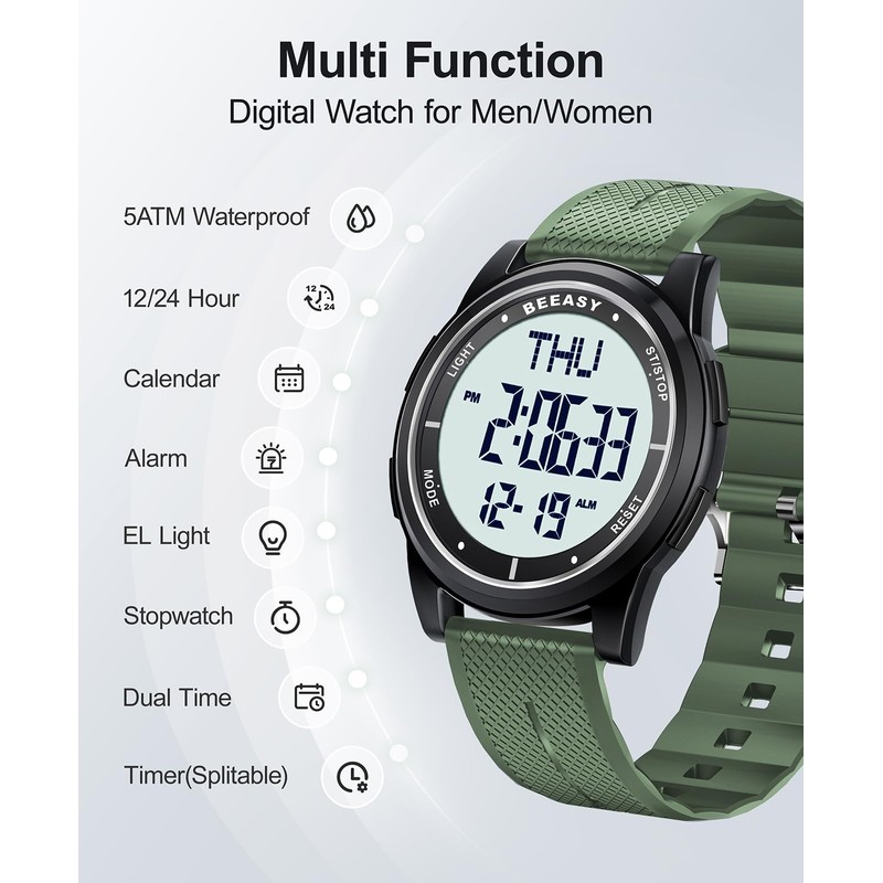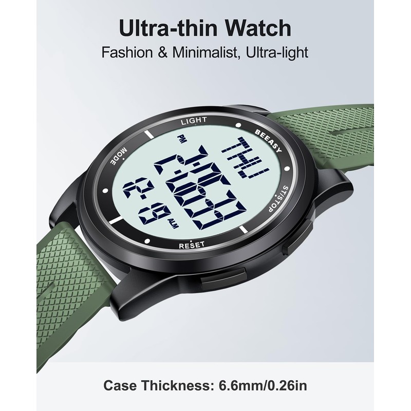 Beeasy Digital Watch Waterproof with Stopwatch Alarm Countdown Dual Time, Ultra-Thin Super Wide-Angle Display Digital Wrist Watches for Men Women-Green(White Dial)