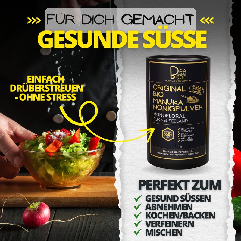 BEEBEAR BeeBear Manuka Honigpulver MGO 550 | Bio Nahrungserg?nzungsmittel & Superfood Pulver fr Smoothie & gesundes Frhstck | Porridge Topping & Msli Topping | Immunsystem st?rken & Energy Pulver