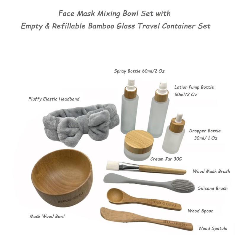 • 【PRACTICAL FACE MASK KIT】The package comes with a set of 9-in-1 DIY skincare tool facial mask bowl set made by natural bamboo frost clear glass, including mask mixing bowl,spoon, spatula,1 facial brushes,cosmetic empty refilable glass cream jar 30g,lotion pump bottle 60ml,spray bottle 60ml,dropper bottle 30ml,silicone mask applicator,headband- this face mask kit is sufficient to create a relaxing DIY facial spa experience at home and the containers are designed to store your skin care products.