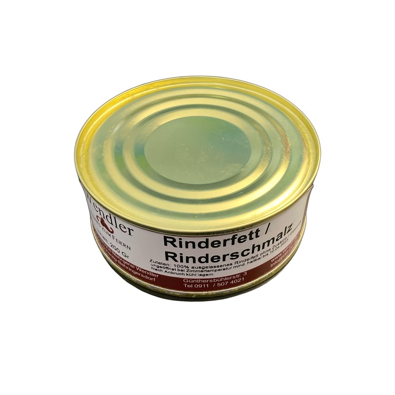 For our beef fat, we leave out beef tallow (the fat tissue between the abdominal membrane and inner abdominal muscles of the beef) in mild heat. We do not add anything else. It only melts at over 30 degrees and has a high smoke point. It is used for searing sausages, there are fried potatoes, blue cabbage, sauerkraut a strong taste and refines Christmas stollen. Also used as a base for bird food dumplings.