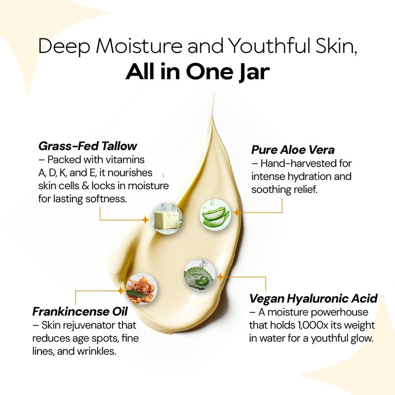 Deep Hydration & Anti-Aging: Grass-fed beef tallow, hyaluronic acid, and frankincense for intense moisture and wrinkle-defying benefits.