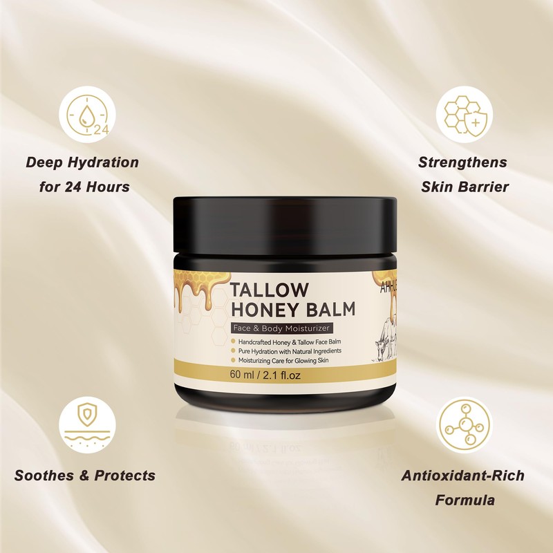 AHHUE Beef Tallow for Skin,Beef Tallow and Honey Balm,Grass-Fed Beef Tallow Beeswax Wild Honey,All Natural Moisturiser,Whole Body & Face Moisturizer (60ML)